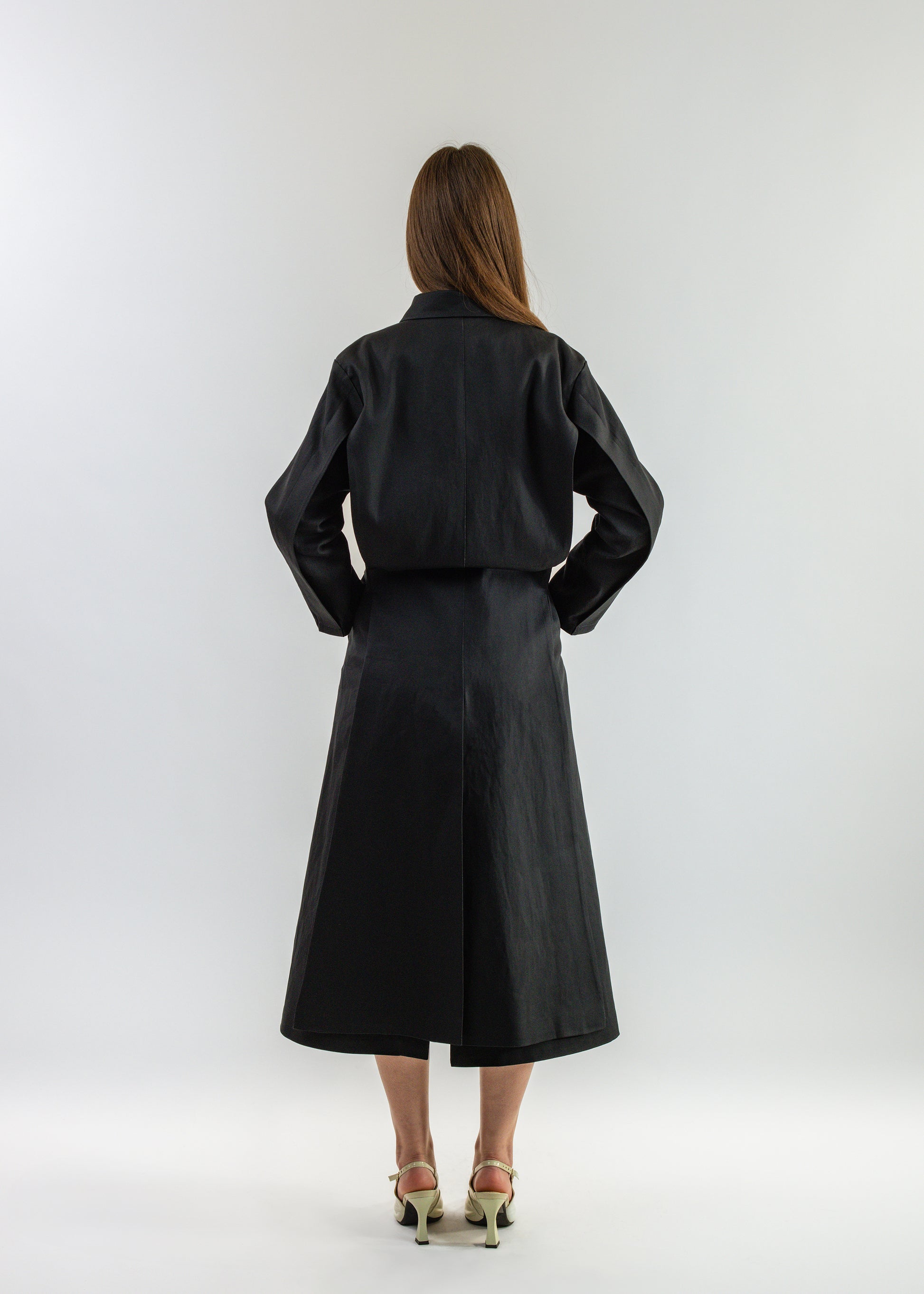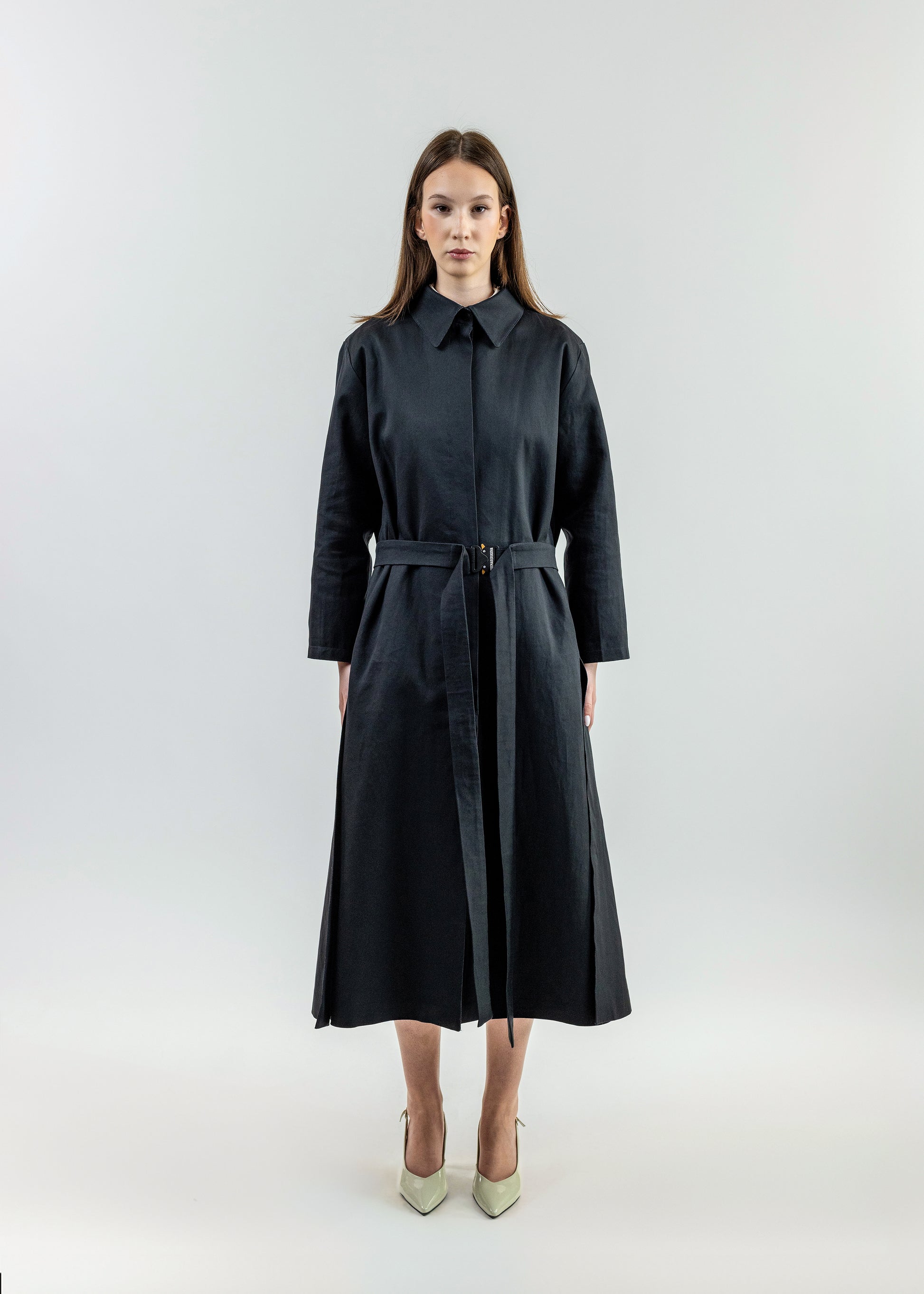 This heavy cotton blend trench coat combines classic elegance with modern flair. Its sleek black finish and meticulous craftsmanship make it a versatile wardrobe staple.