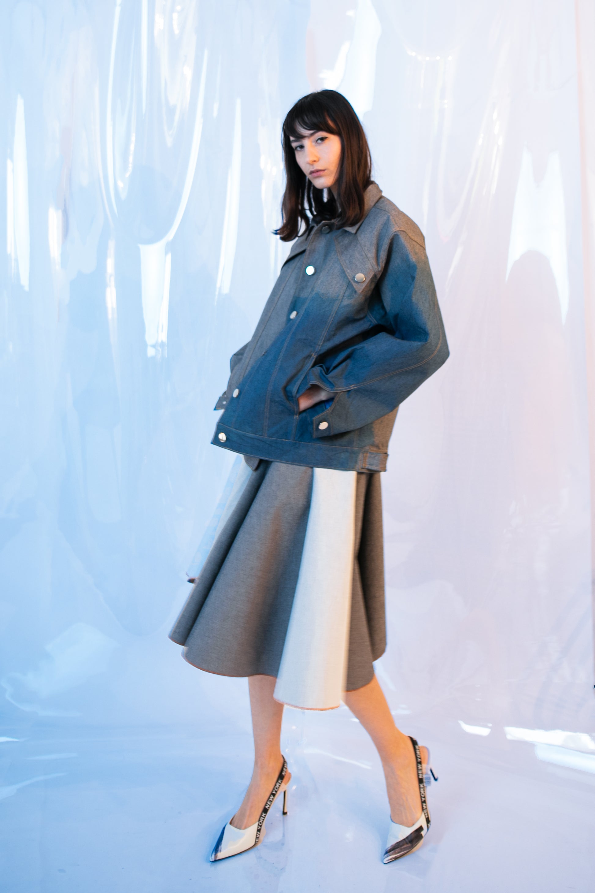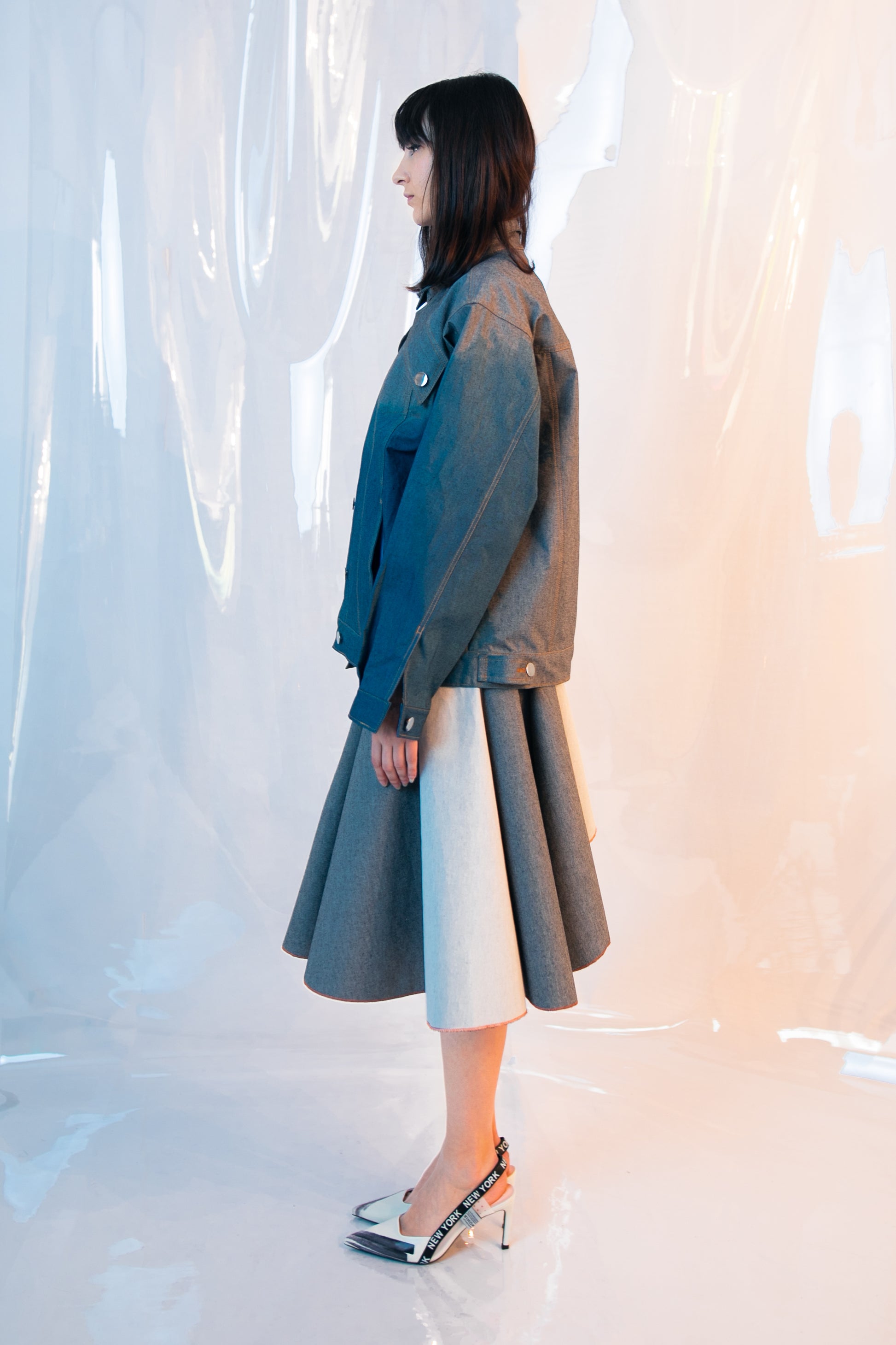 Oversized blue-grey hand-painted and treated denim jacket with side pockets. Combined with thirteen asymmetrical panels and metallic zippers.