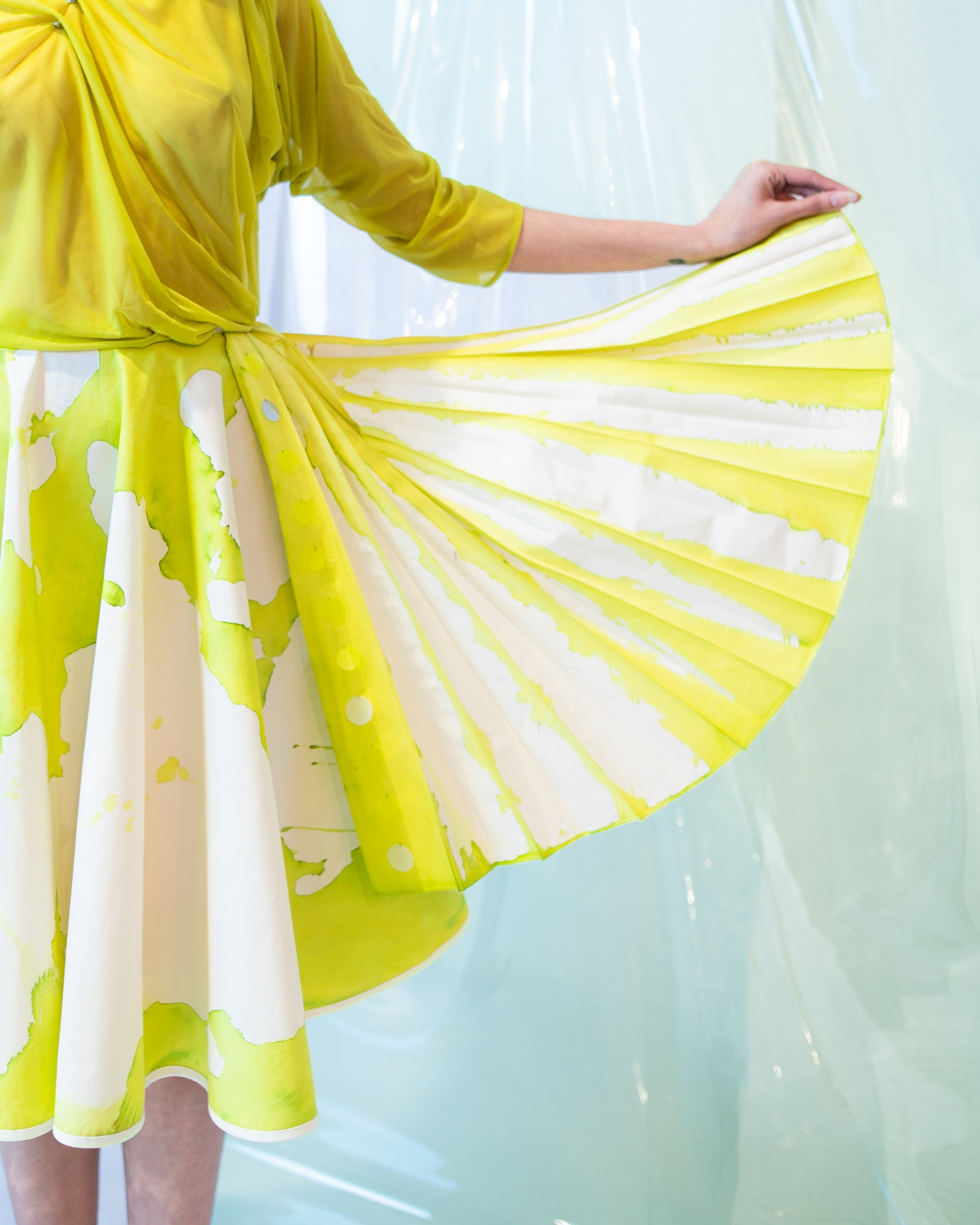 Hand-painted full skirt featuring stitched pleated layers and translucent sequence embroidery.