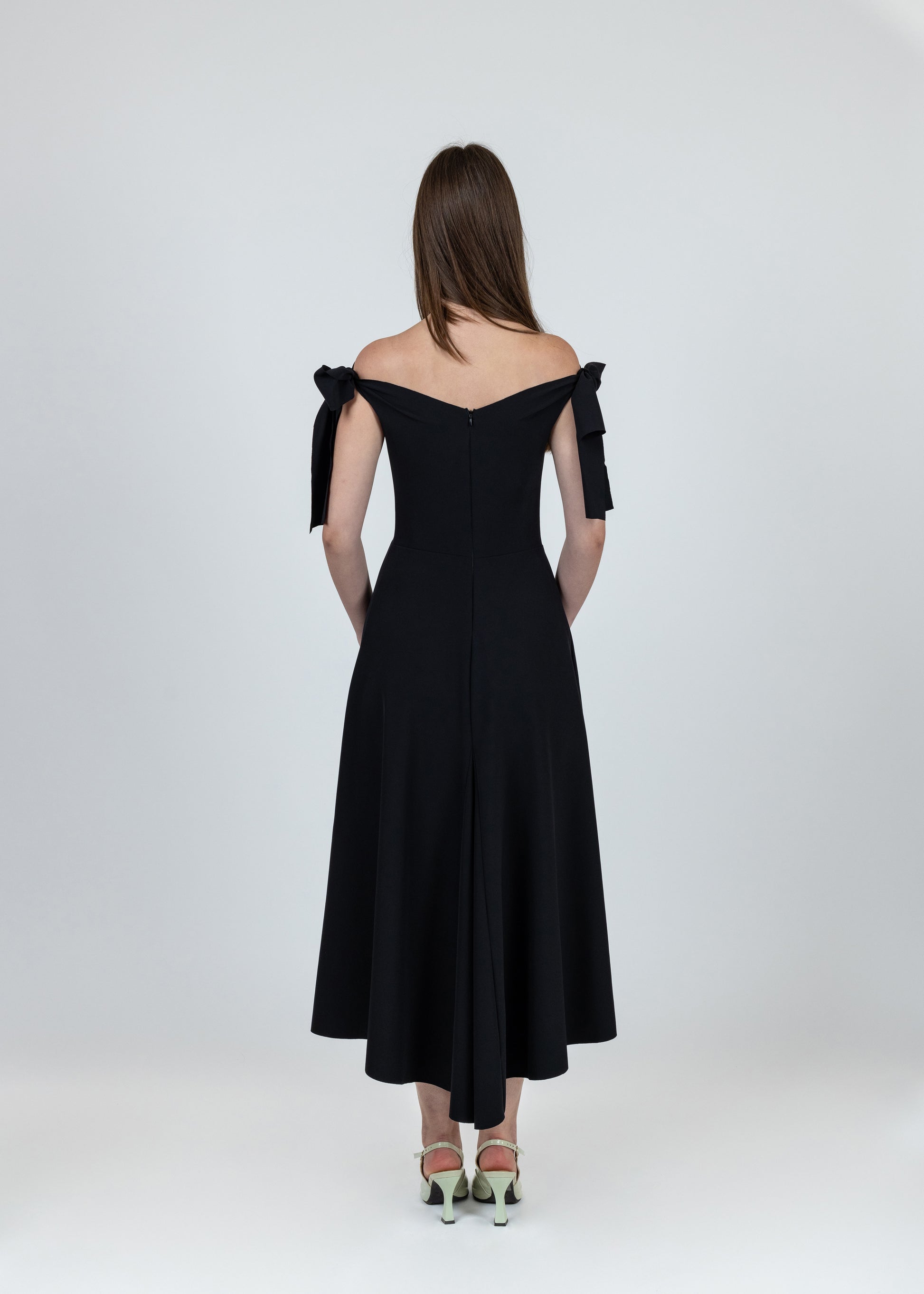 - Delicate bows on each shoulder add a sophisticated touch.