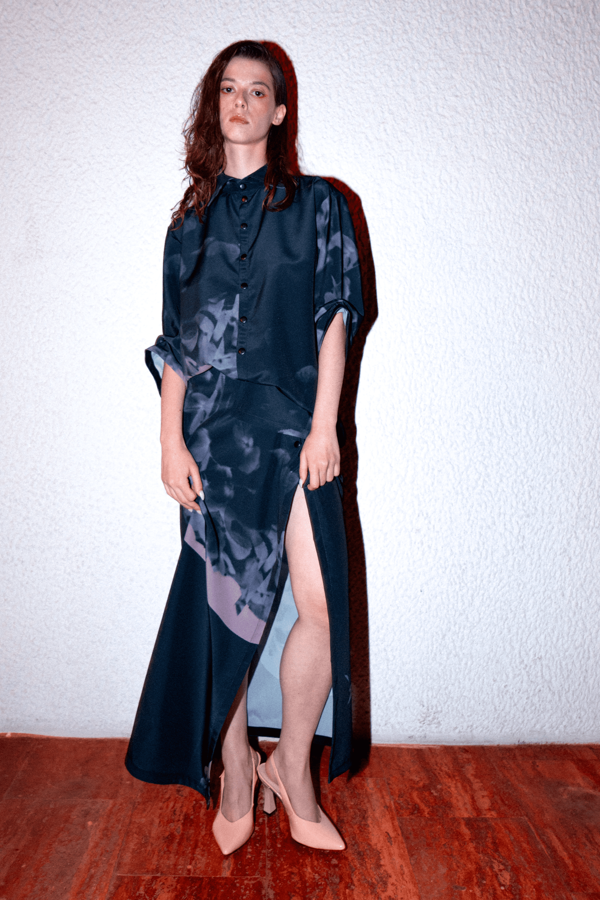 The hydrangea printed shirt and skirt ensemble features a vibrant floral design, combining elegance with a touch of bold style. The skirt is accentuated by a chic front slit, adding a modern twist to the classic, feminine silhouette.