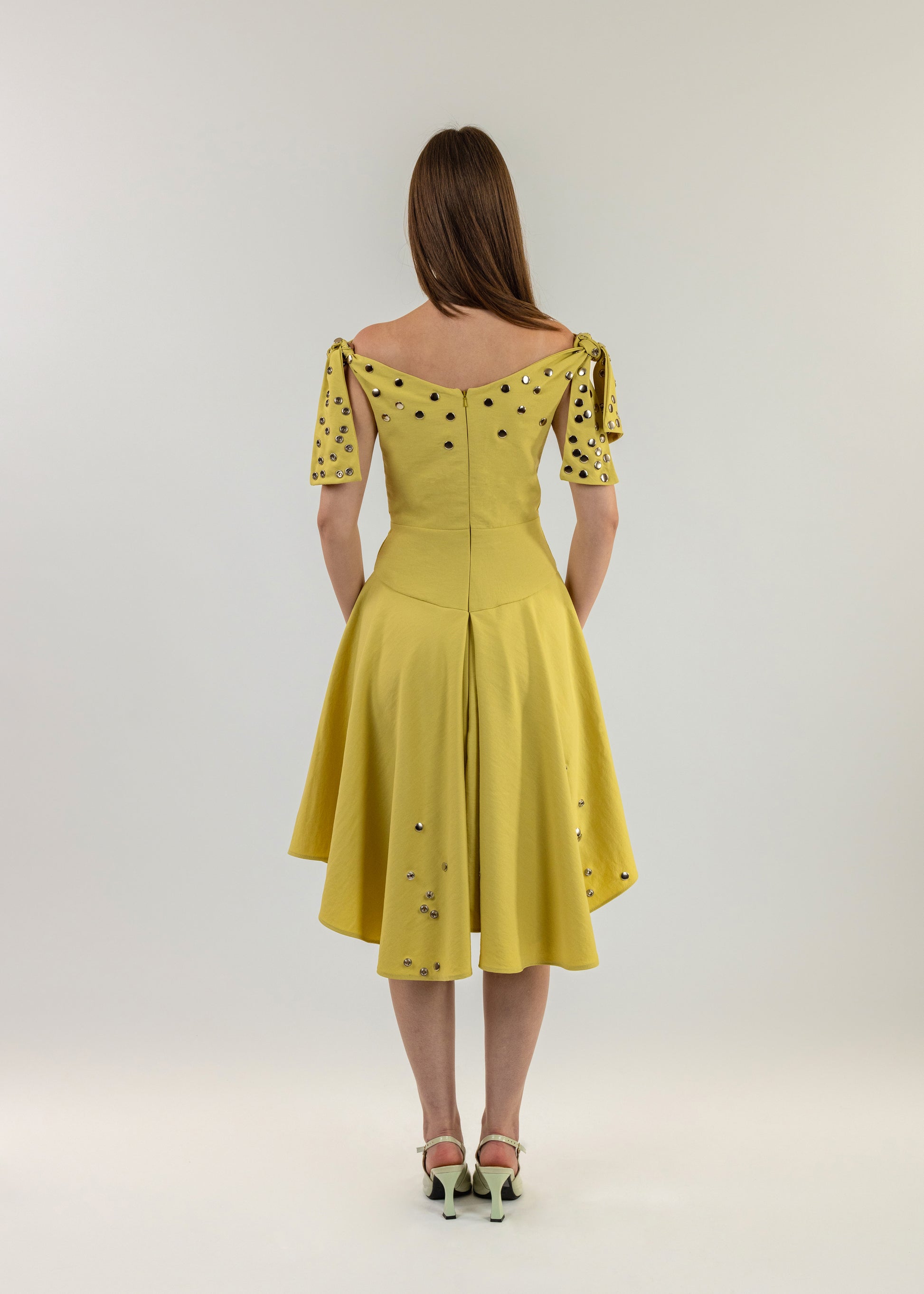 This dress showcases a sleek, fitted front that highlights your silhouette, complemented by a full skirt and front side slit.