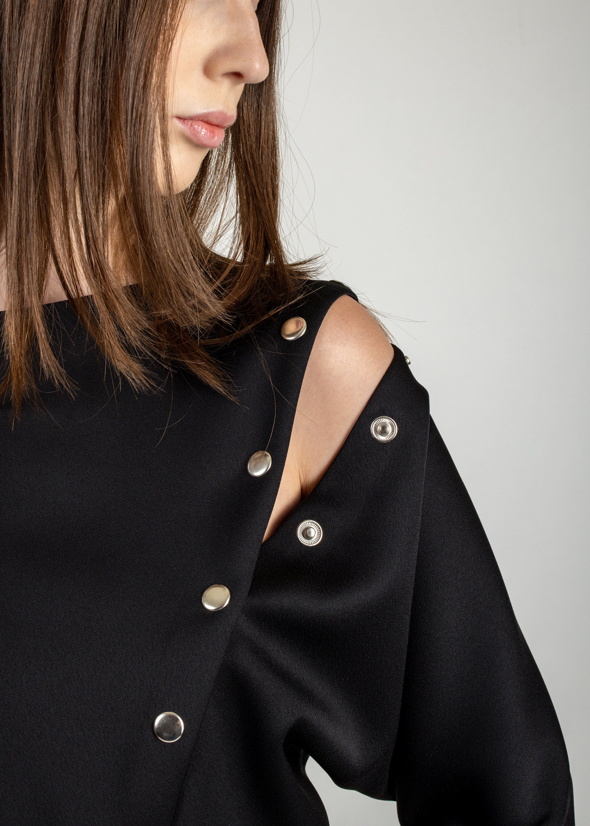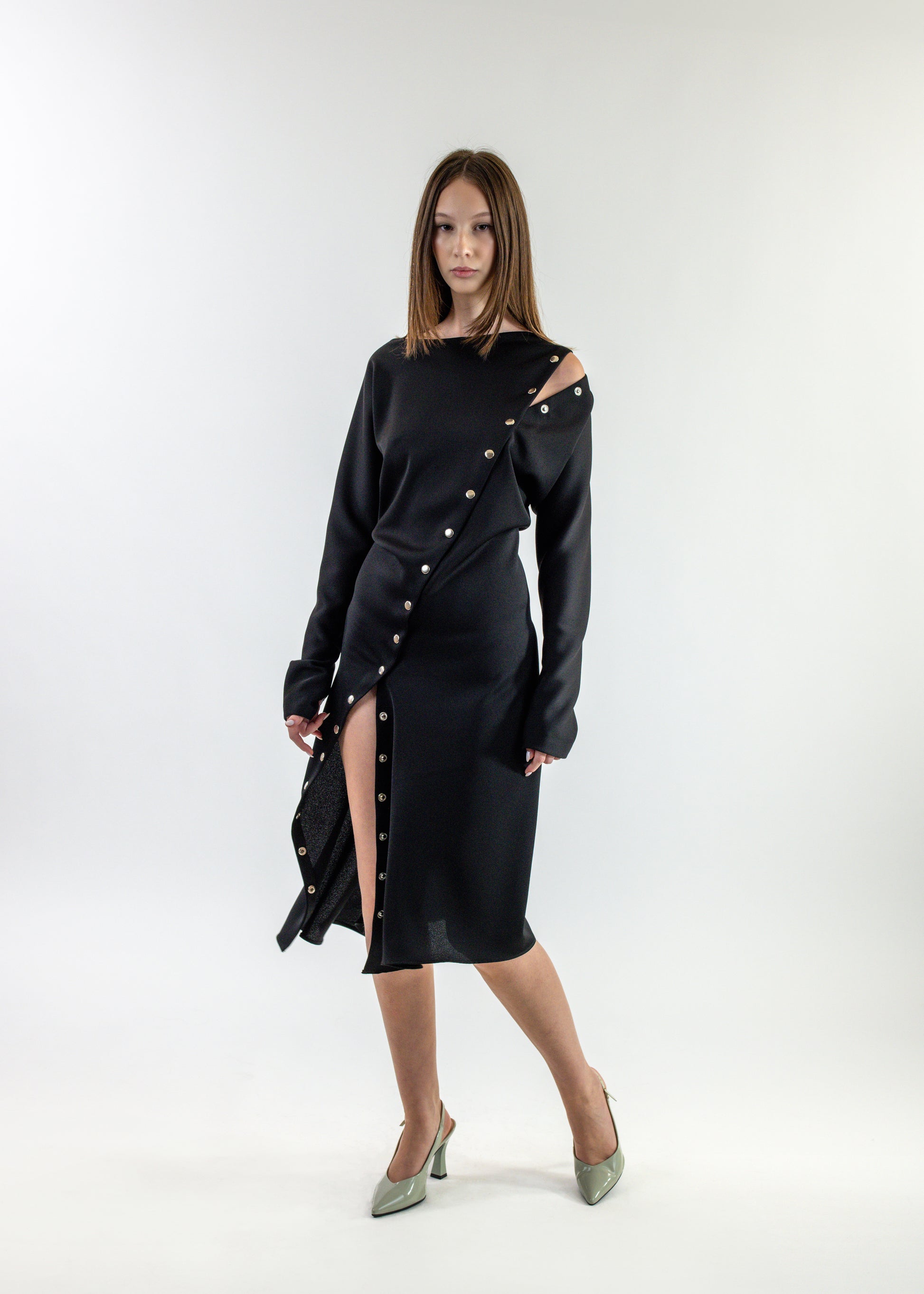 This bias-cut black sateen dress, knee-length and elegantly modern, is crafted from luxurious fabric that catches the light beautifully.