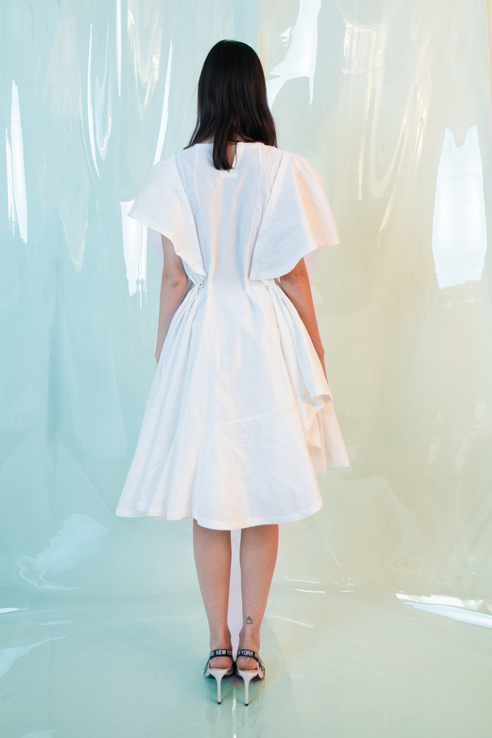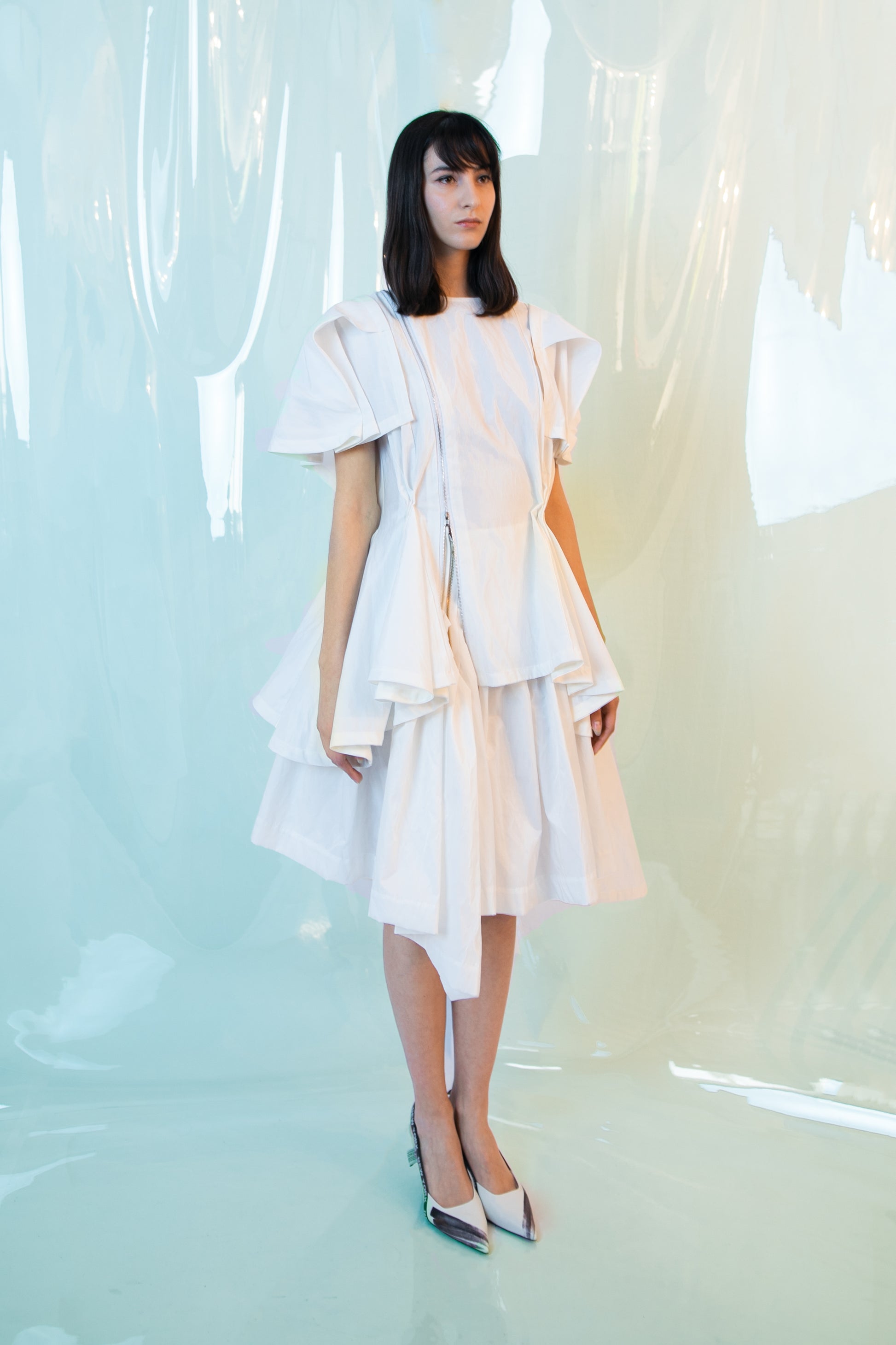 Exceptional constructed cotton poly blend top featuring side front metallic zipper and voluminous shoulders combined with knee length asymmetrical skirt.