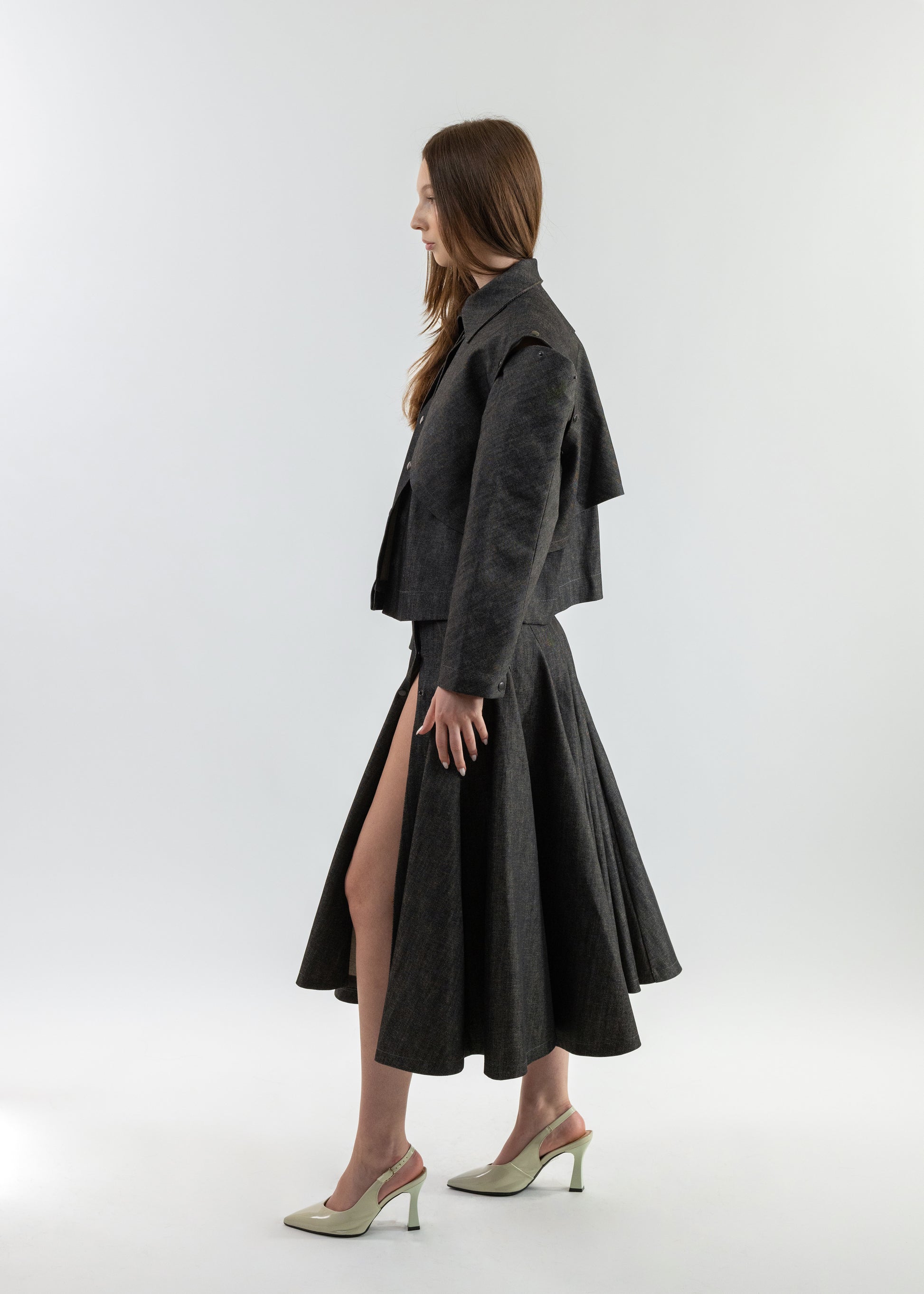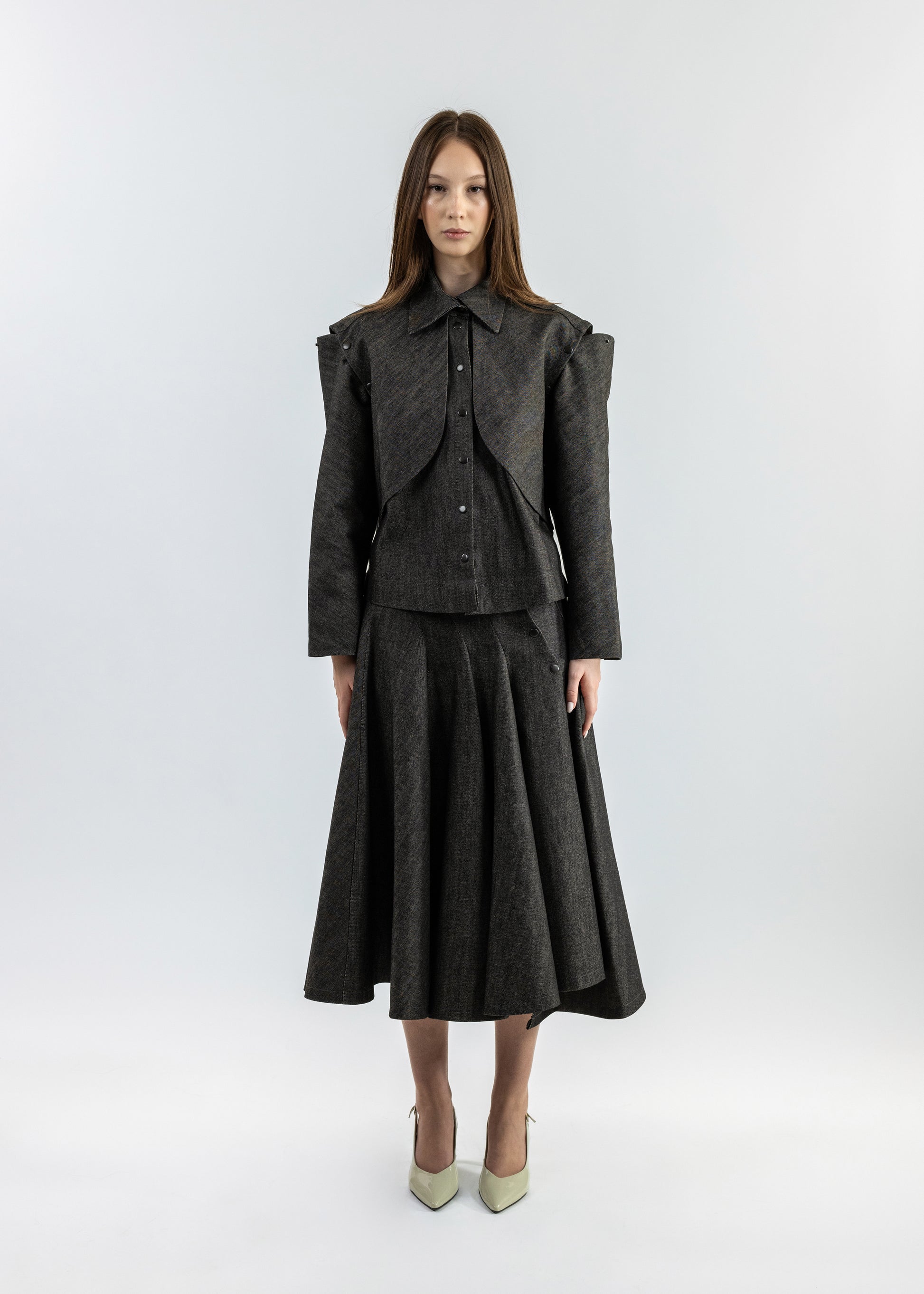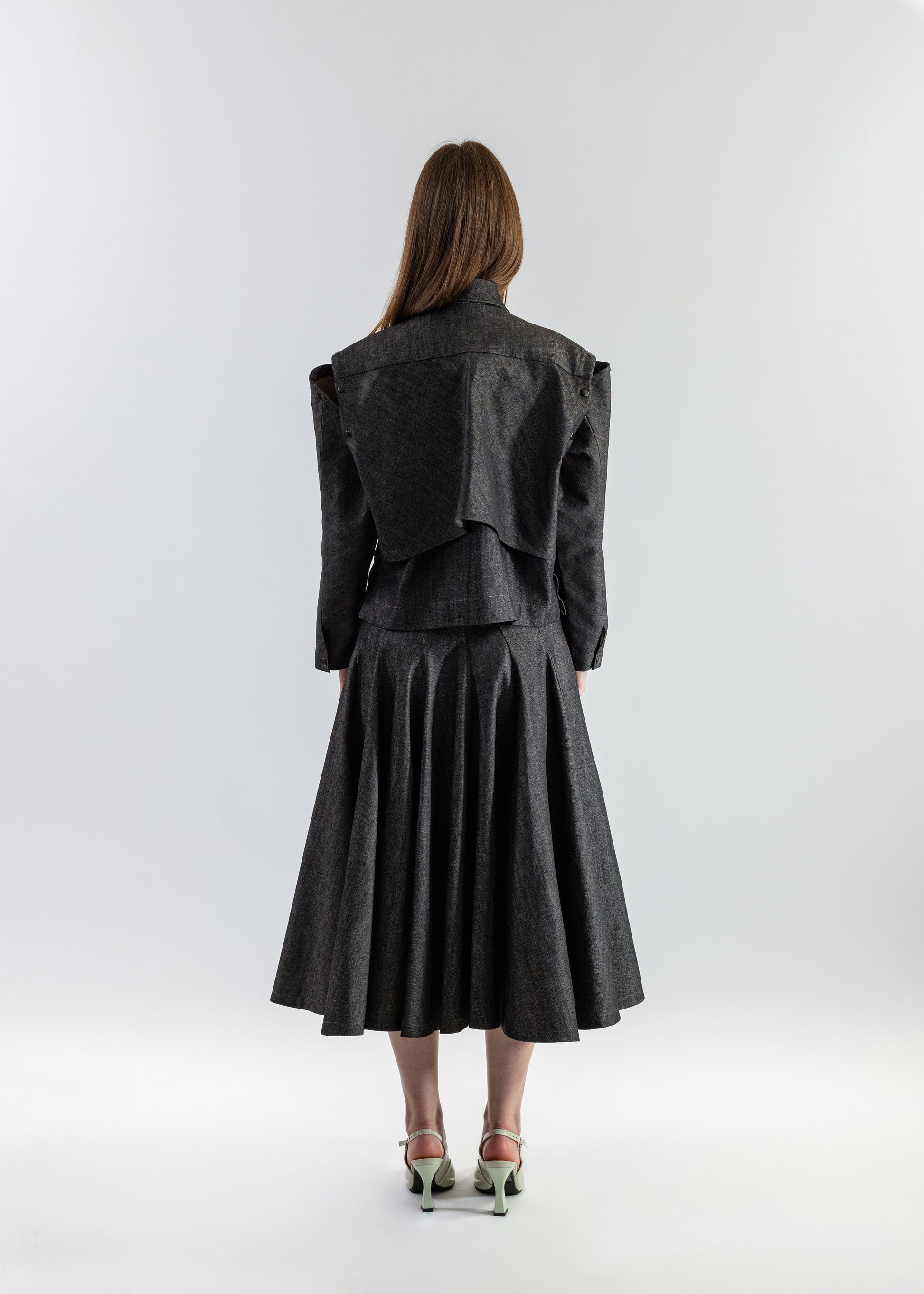 This denim set includes a waist-length jacket and a mid-length voluminous skirt, showcasing an asymmetrical panel layout for a contemporary twist.
