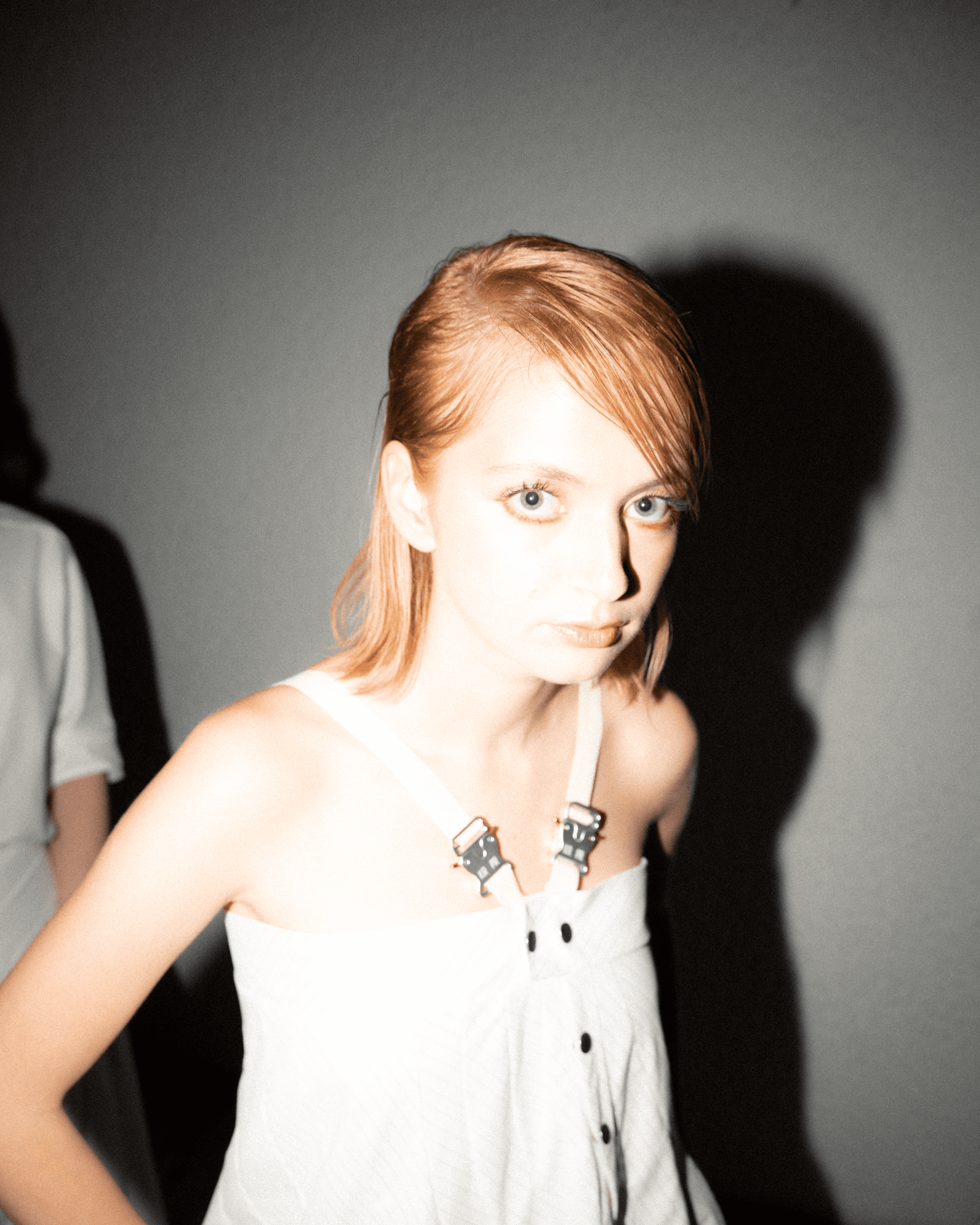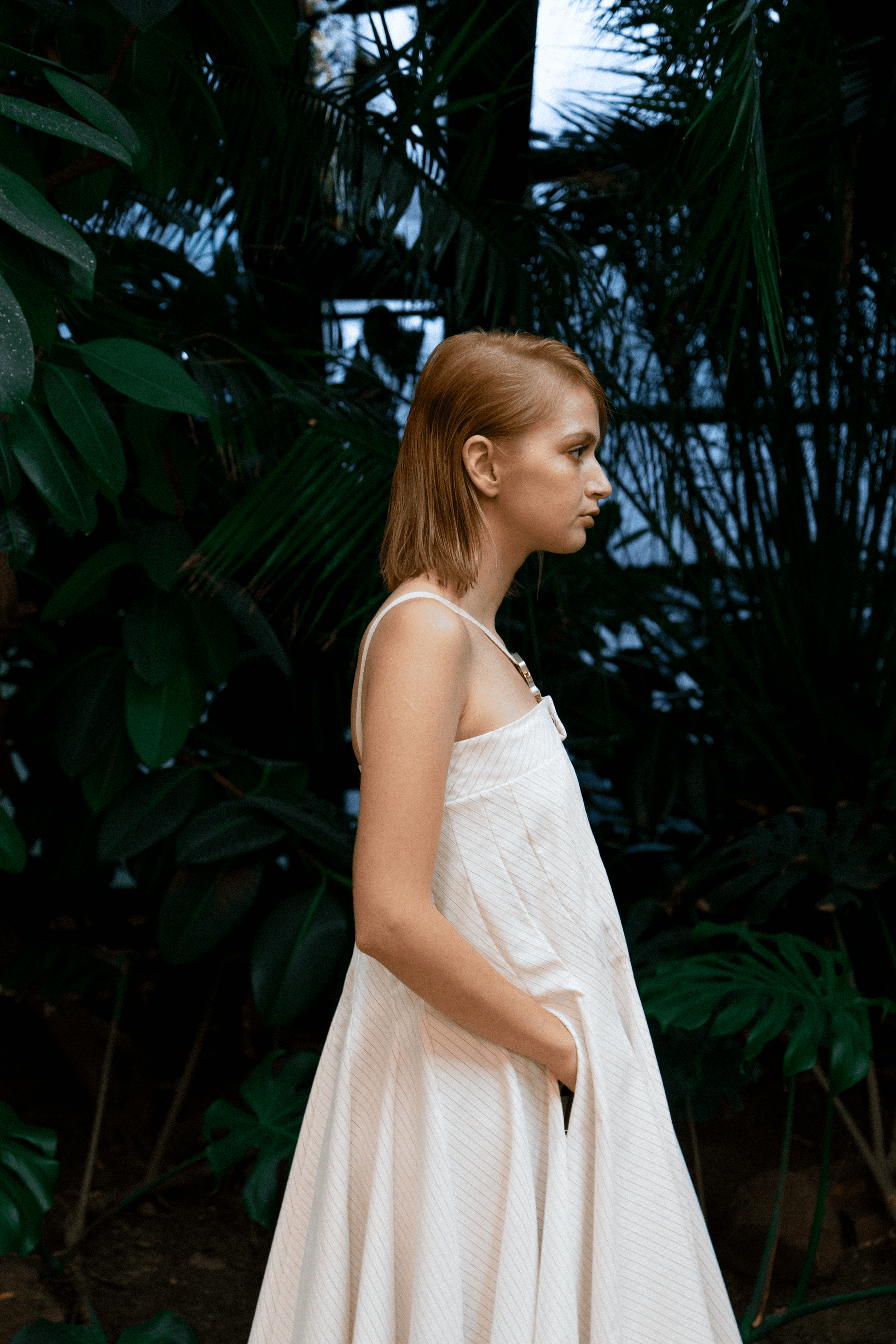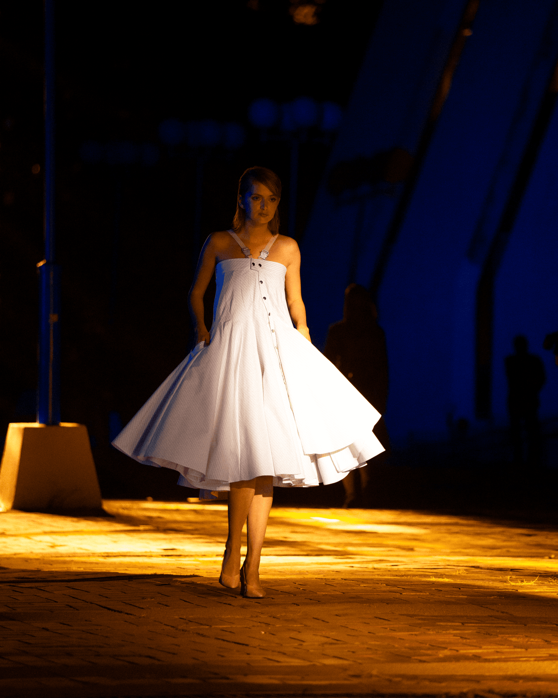 Thirteen panel asymmetrical constructed, with side pockets and V neck straps with silver laser engraved buckles