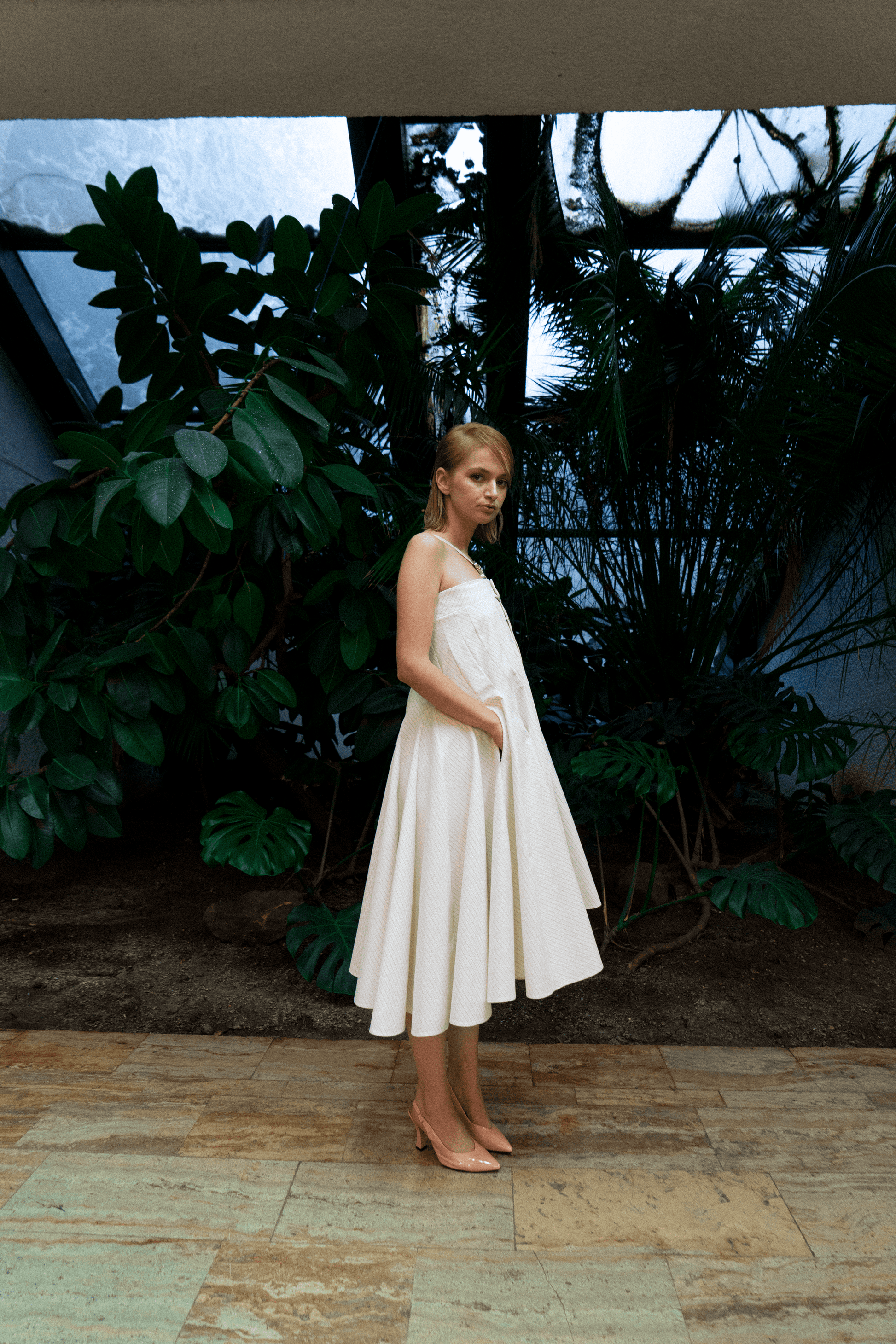 This stylish piece showcases a thirteen-panel asymmetrical design, offering a unique and contemporary look. It features practical side pockets and V-neck straps adorned with silver laser-engraved buckles, adding a touch of sophistication and detail.